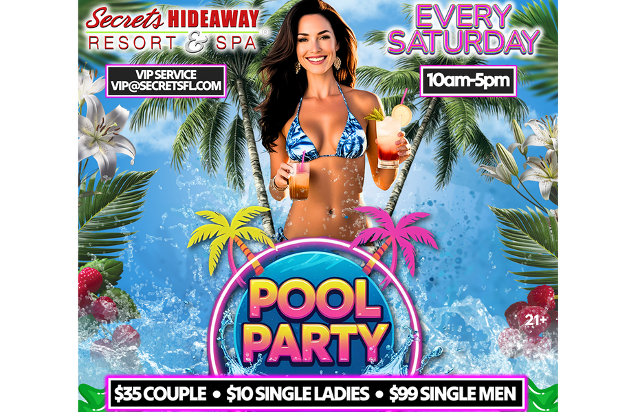 Get ready to indulge in the epitome of Saturday bliss at Secrets Hideaway's exclusive Saturday Pool Party, held every Saturday from 10 am to 5 pm. Shed your inhibitions along with your clothes and immerse yourself in the epitome of sensual freedom at Orlando's hottest clothing-optional pool event. With the sun beaming down and the temperature rising, Secrets Hideaway invites you to strip down, cool off, and join your sexiest friends for a day of pure, unadulterated pleasure. Picture yourself lounging poolside, drink in hand, surrounded by the rhythmic beats of hot music and the sizzling presence of even hotter friends. Secrets Hideaway Resort and Spa's courtyard pool area, complemented by two outdoor tiki bars, forms the perfect backdrop for this seductive rendezvous, where you can let go, be free, and celebrate the heat of summer in the most alluring way possible.